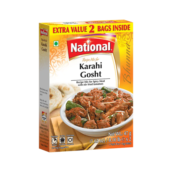 National Karahi Recipe Mix creates a pefect combination of spicy meat with stir fried tomatoes, specially made by a panel of experts, using aromatic spices and the finest ingredients in exactly the right measure. It will enable you to cook delicious meals with ease that you and your loved ones can relish each day.