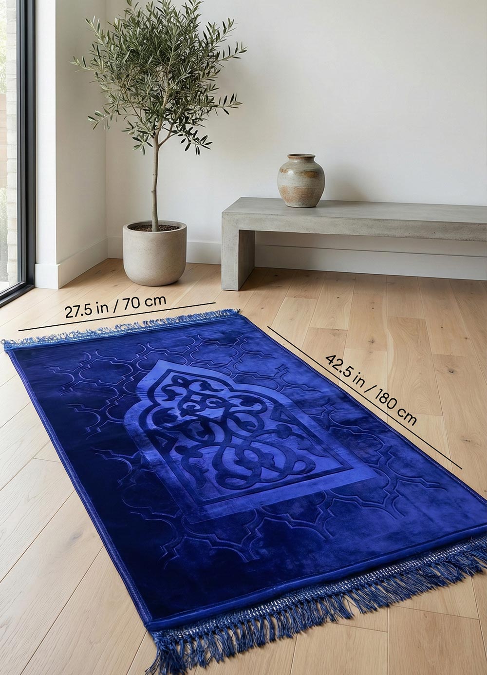 This is a striking Royal Blue prayer rug. It has a much more modern, architectural feel compared to the previous one, especially with that bold center motif.