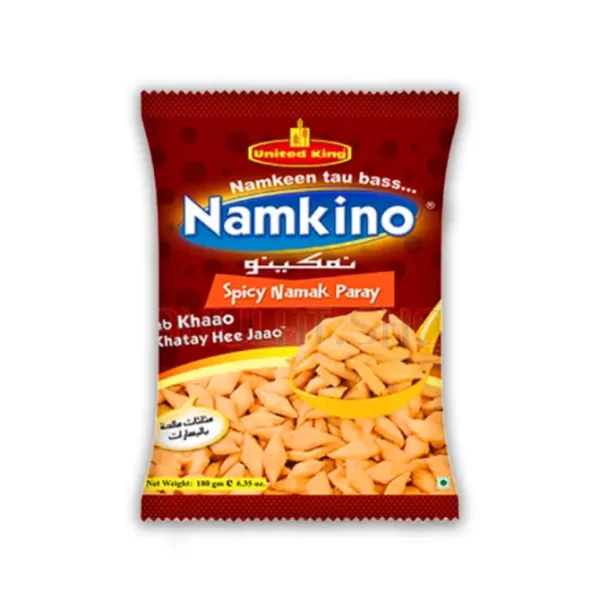 United King Namkino Spicy Namak Paray offers a pack of crispy, spicy diamond-shaped snacks, perfect for enjoying with tea or as a standalone savory treat.